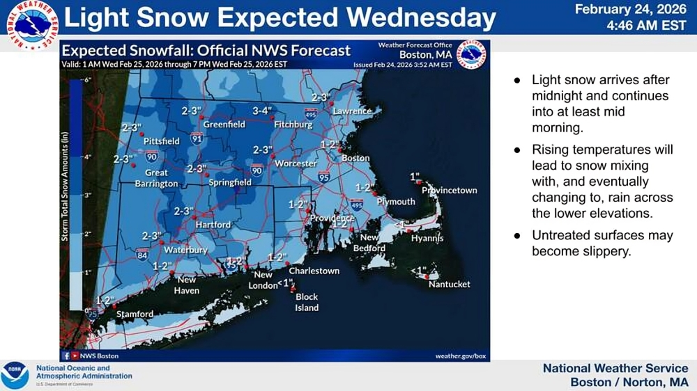 Hacia la madrugada siguiente aumentarán las probabilidades de precipitación invernal, con acumulaciones estimadas entre una y tres pulgadas, principalmente en áreas elevadas como los Berkshires y Worcester.