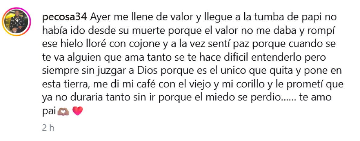 “Ayer me llene de valor y llegue a la tumba de papi no había ido desde su muerte porque el valor no me daba y rompí ese hielo lloré con cojone y a la vez sentí paz porque cuando se te va alguien que ama tanto se te hace dificil entenderlo pero siempre sin juzgar a Dios porque es el unico que quita y pone en esta tierra, me di mi café con el viejo y mi corillo y le prometí que ya no duraria tanto sin ir porque el miedo se perdio…… te amo pai🫶🏽❤️”.