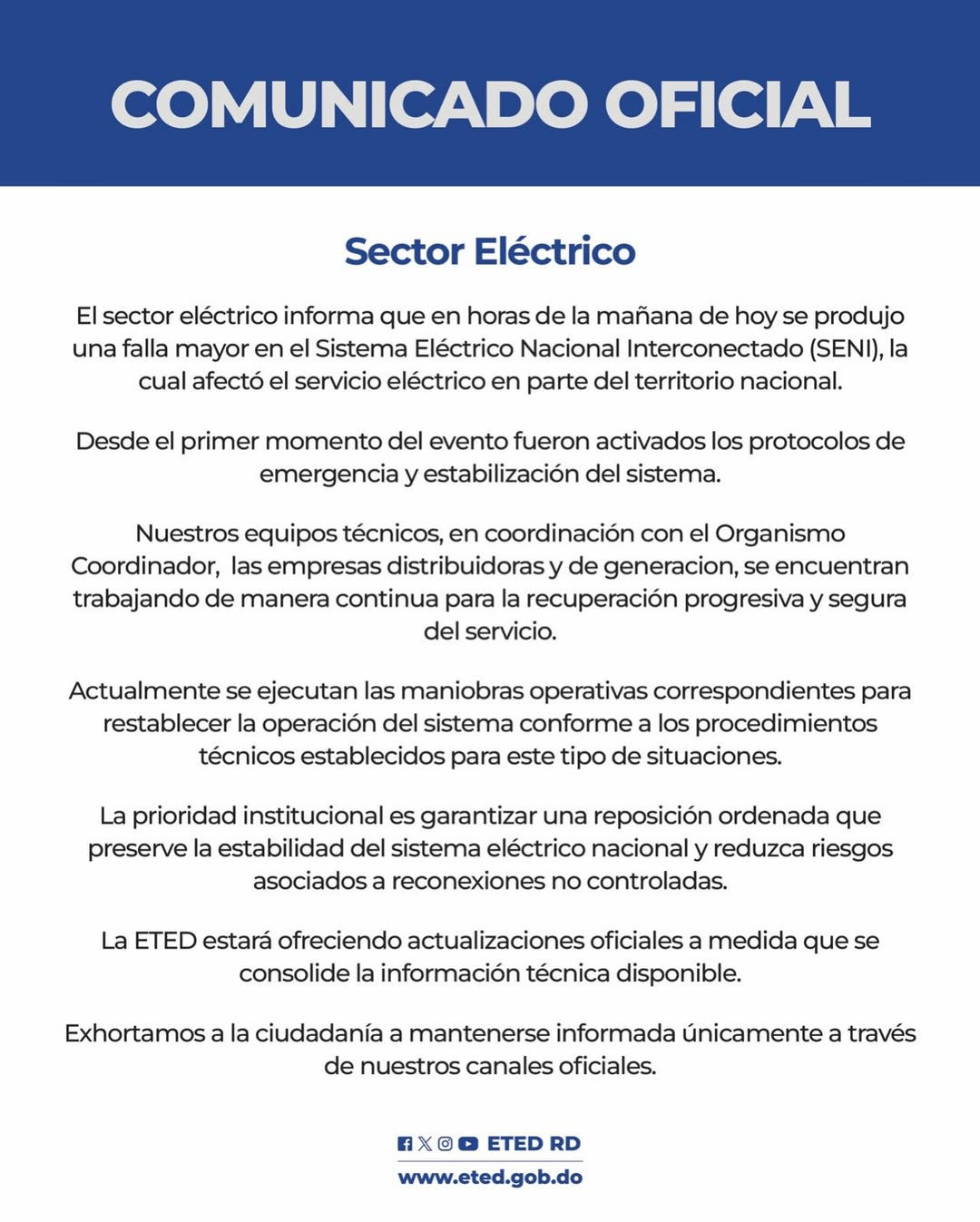 La ETED aseguró que ofrecerá actualizaciones oficiales a medida que se consolide la información técnica disponible sobre el incidente y el avance en la normalización del servicio eléctrico.
