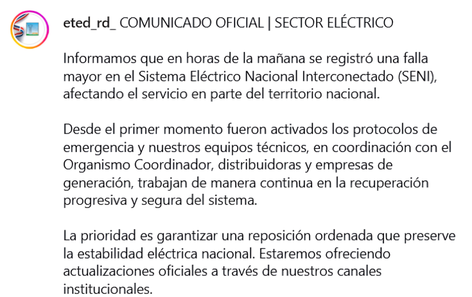 Cabe recordar que la interrupción comenzó a las 10:53 de la mañana y afectó zonas del Distrito Nacional, Santiago, Dajabón, El Seibo, Peravia, San Francisco de Macorís y Santo Domingo Este.