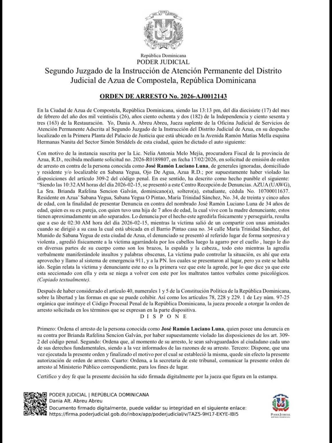 Diario al Día, Azua- La Fiscalía de la provincia de Azua de Compostela solicitó una orden de arresto y conducción en contra del sargento de la Policía Nacional José Ramón Luna Luciano, acusado de violencia de género.
