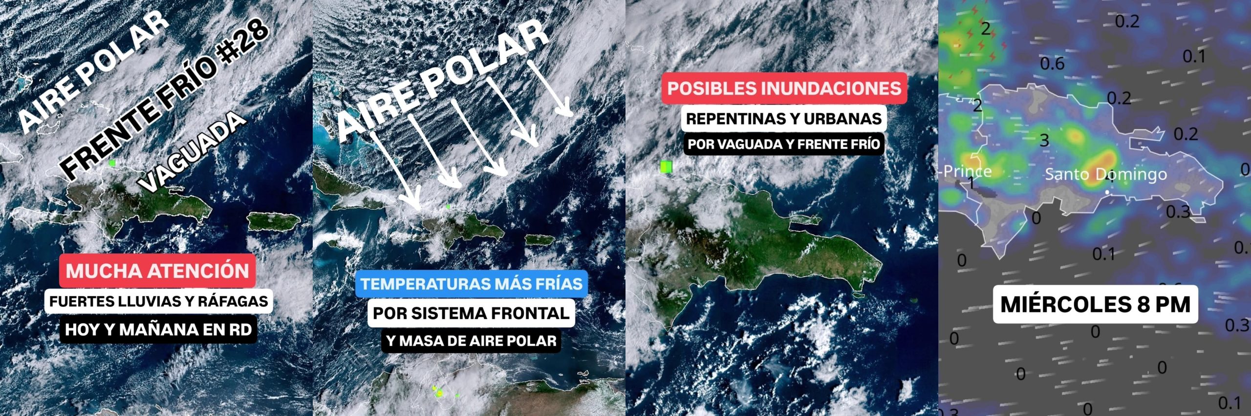 Diario al Día, República Dominicana- El frente frío número 28 ya influye sobre el norte del país junto a una vaguada y una masa de aire frío, incrementando los aguaceros en las próximas horas.