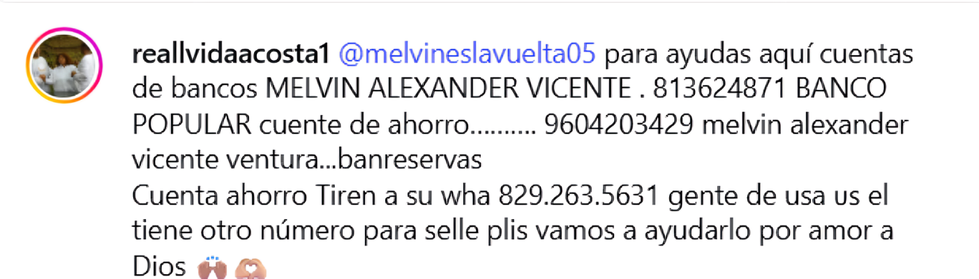 Quienes deseen aportar pueden hacerlo mediante transferencia bancaria a nombre de Melvin Alexander Vicente Ventura en Banco Popular, cuenta de ahorro número 813624871.